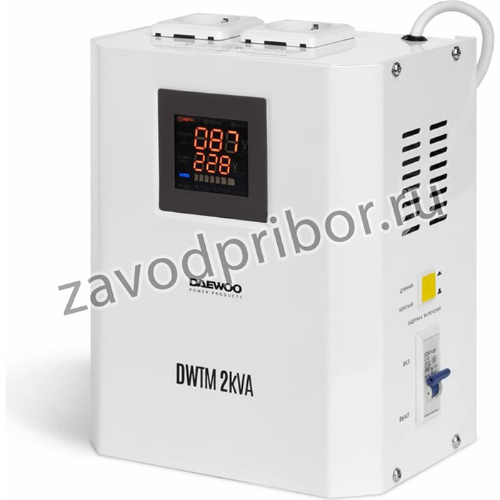 Настенный стабилизатор напряжения DAEWOO DW-TM2kVA устанавливается в квартирах, в небольших офисных помещениях и в других местах, где есть необходимость выравнивания входного напряжения для защиты высокоточного оборудования и электроники. Управление устройством построено на основе микропроцессора, что позволяет агрегату максимально быстро среагировать на перепад напряжения, а также оптимизировать работу всей системы стабилизации. Бесшумный, обладающий небольшими размерами и малым весом стабилизатор способен выдержать нагрузку до 2000 Вт. Подключение потребителей осуществляется через две розетки на 220 В, интегрированные в корпус устройства.