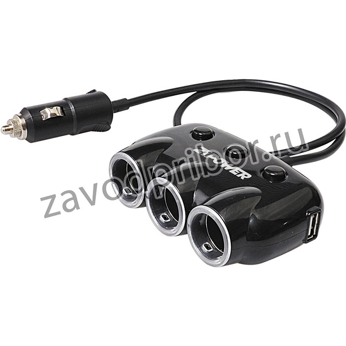 3 гнезда. Плавкий предохранитель. LED-подсветка. Быстрая зарядка. Выключатель питания на каждом гнезде.