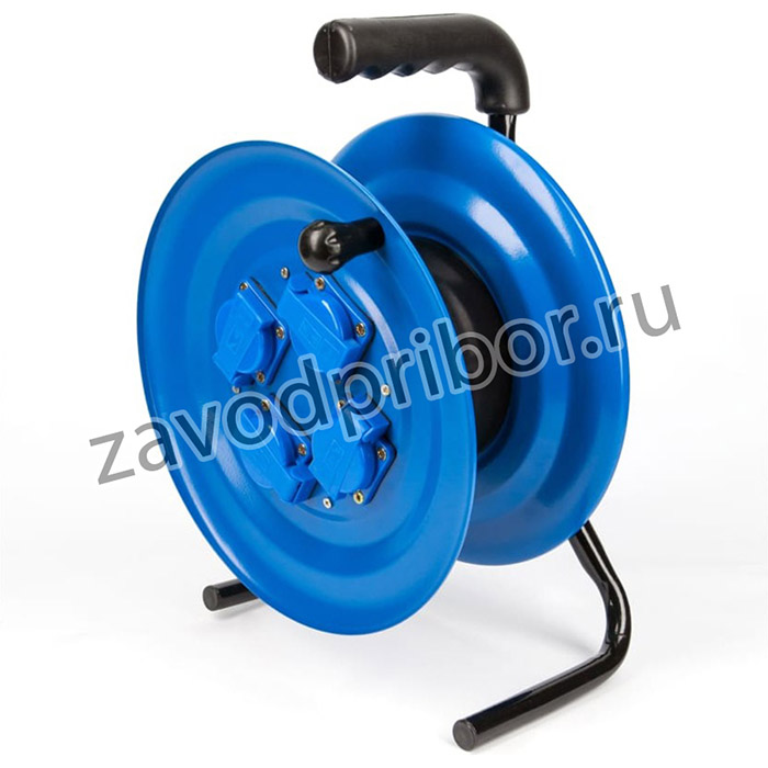 На корпусе катушки располагается устойчивая подставка и специальная рукоятка для удобства переноски удлинителя. Катушка без удлинителя, диаметр 30 см, 4 розетки с заземлением, металлическая катушка без провода, металлическая тренога, IP-44 Длина провода с сечением 3х2.5 составит ±50 м.