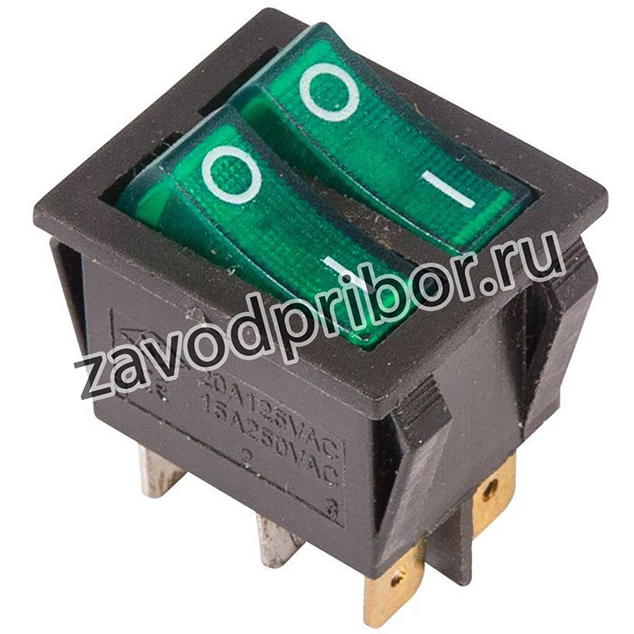 Выключатель клавишный 250V 15А (6с) ON-OFF зеленый с подсветкой ДВОЙНОЙ предназначен для коммутации электрических цепей переменного тока напряжением до 250В. Клавишные (Рокерные) выключатели применяются в качестве комплектующих изделий различного электрооборудования (в сетевых фильтрах и удлинителях, аудио-оборудовании, блоках питания, электроустановках на различных производствах, автомобилях, и многих других местах). Такой клавишный переключатель имеет два положения и две клавиши, что позволит раздельно коммутировать контактные группы. Принцип действия основан на перемещении клавиши в одну из позиций. Для переключения в нужное положение требуется приложить некоторые усилия на клавишу. Монтаж осуществляется без применения винтов на плоских панелях толщиной от 0.8мм до 3мм. Подключение контактов осуществляется плоской клеммой 6.6мм либо с помощью пайки.Основные характеристики: