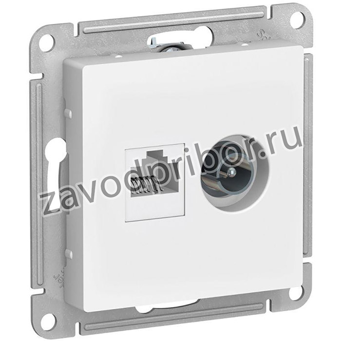 Механизм Schneider Electric AtlasDesign (цвет белый) двойной розетки разъёмами RJ45 категория 5е и TV предназначен для удобного и быстрого подключения вашего компьютера и телевизора к соответствующим сетям. - Пластик с ионами серебра в белом цвете обеспечивает антибактериальный эффект. - Лицевые детали из качественного ABS-пластика, устойчивого к царапинам и УФ-излучению. - Усиленные прямые монтажные лапки для лучшей фиксации механизма в монтажной коробке. Заявка: