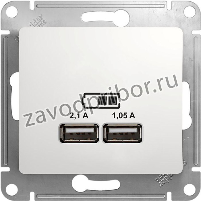 Механизм Systeme Electric (ранее Schneider Electric) серии Glossa (цвет белый) розетки с двумя разъёмами USB с выходными напряжением 5 В постоянного тока и выходами с номинальным током по 2.1 А.- Предназначен для зарядки мобильных устройств: телефоны, планшетные компьютеры, mp3/mp4 плееры.