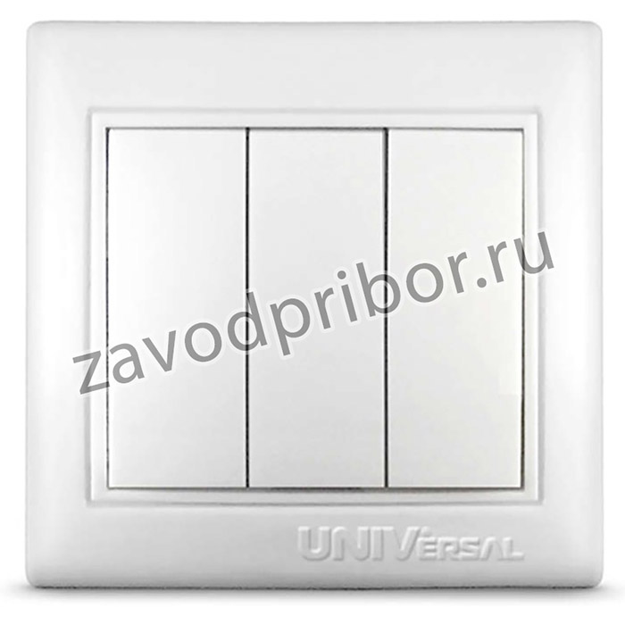 Выключатель 3-кл. СП Севиль бел. UNIVersal C0043 – электроустановочное устройство скрытой установки (монтируется под штукатурку).Представляет собой трехклавишный выключатель. Изготовлен из пластика, белого цвета.