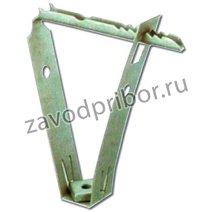 Крепление для профнастила имеет трепецевидную форму. Это изделие предназначено для подвешивания монтажных систем и элементов к волне профнастила. Для фиксации применяются шпильки М10. Заявка: