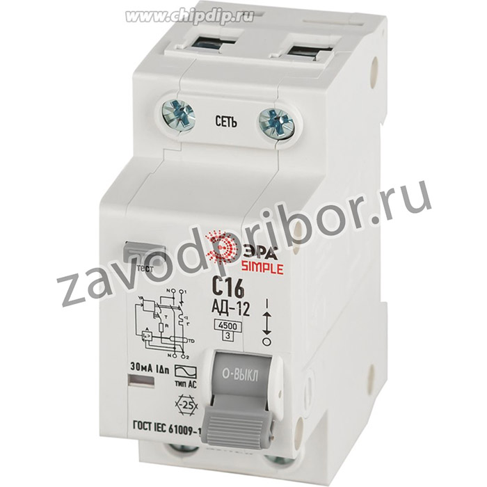 АВДТ 4,5кА ЭРА SIMPLE D12E2C16AC30 АД-12 электронное 1P+N С16 30мА тип АС Б0058920
