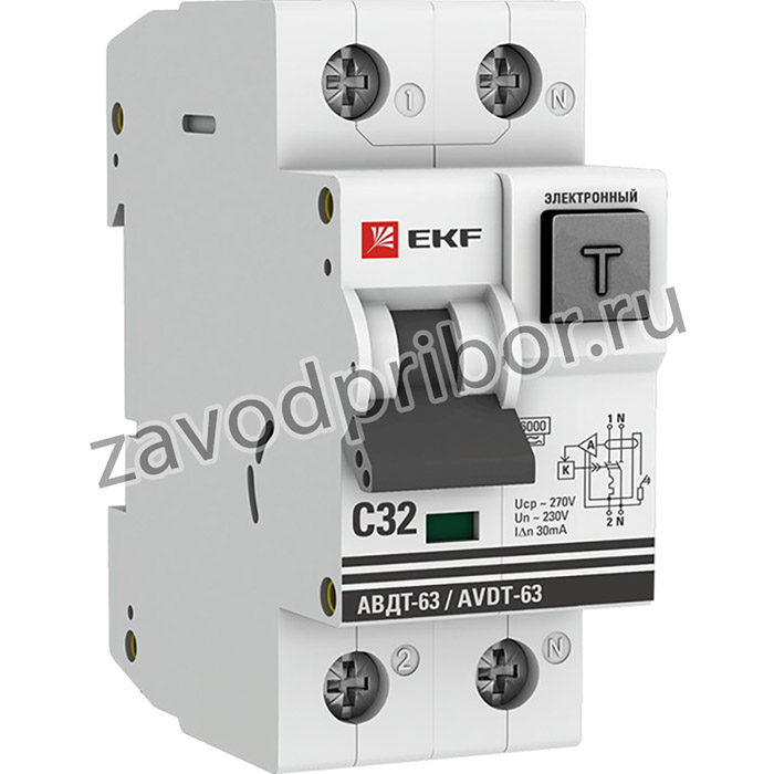 Выключатель автоматический дифференциального тока 2п C 32А 30мА тип A 6кА АВДТ-63 2мод. электрон. PROxima EKF DA63-32-30e