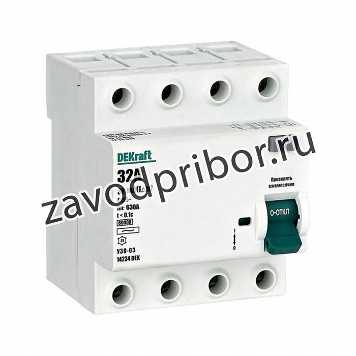 Выключатель дифференциального тока серии УЗО-03 DEKraft; 4P; номинальный ток 32 А; ном.дифф. ток 30 мА; электромеханический; тип дифференциального расцепителя - AC; на DIN-рейку. ВДТ устанавливаются в сетях напряжением до 400 В пер.тока. ВДТ применяются для защиты электроустановок от риска возникновения пожаров вследствие утечек тока. Конструкция устройств позволяет эксплуатировать их даже при низкой температуре.При сборке выключатель дифференциального тока (ВДТ) и автоматический выключатель (для защиты ВДТ) устанавливаются последовательно, при этом номинальный ток аппарата должен быть на одну ступень выше - т. е. 20А при установке последовательно с автоматом на 16А, 32А при установке с автоматом на 25А.