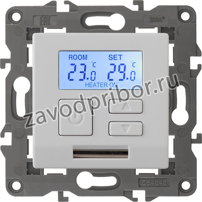Терморегулятор теплый пол / отопление электронный серии Эра Elegance цвет белый 14-4111-01. Рамки приобретаются отдельно. Рамки Эра Elegance ПЛАСТИК: 1 пост 14-5001-хх, 2 поста 14-5002-хх, 3 поста 14-5003-хх, 4 поста 14-5004-хх, 5 постов 14-5005-хх; СТЕКЛО: 1 пост 14-5101-хх, 2 поста 14-5102-хх, 3 поста 14-5103-хх, 4 поста 14-5104-хх; МЕТАЛЛ: 1 пост 14-5201-хх, 2 поста 14-5202-хх, 3 поста 14-5203-хх, 4 поста 14-5204-хх; ДЕРЕВО: 1 пост 14-5301-хх, 2 поста 14-5302-хх, 3 поста 14-5303-хх, 4 поста 14-5304-хх (хх - код цвета: 00-прозрачный, 01-белый, белёный дуб, 02-слоновая кость, 03-алюминий, 04-шампань, 05-чёрный, чёрное дерево, 07-ясень, 09-дуб, 10-венге, 11-клён, 14-медь, 21-жёлтый, 22-оранжевый, 23-красный, 25-бордо, 26-лайм, 27-зелёный, 28-голубой, 29-синий, 30-розовый, 31-мокко, 32-серый, 41-сталь, 42-титан). Заявка: