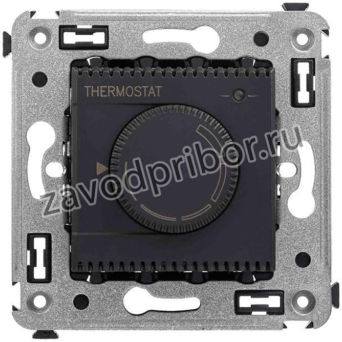 Термостат для теплых полов. Назначение: для монтажа в подрозеточные коробки глубиной не менее 45 мм (код 59301);. Предназначен для управления теплыми полами. Характеристики: диапазон от 5 до 30 С; частота 5060 Гц; номинальное напряжение 230 В; лампа-индикатор включается, когда температура в комнате падает ниже выбранного значения; нагрузка: 5 A cos=1, 2 A cos=0,4. Фиксация производится в подрозеточные коробки глубиной не менее 45 мм при помощи каркаса с лапками (код 4400802) и саморезов; провод датчика температуры в комплекте (длина 3,5 метра). 2 модуля. Цвет: Черный матовый. Заявка: