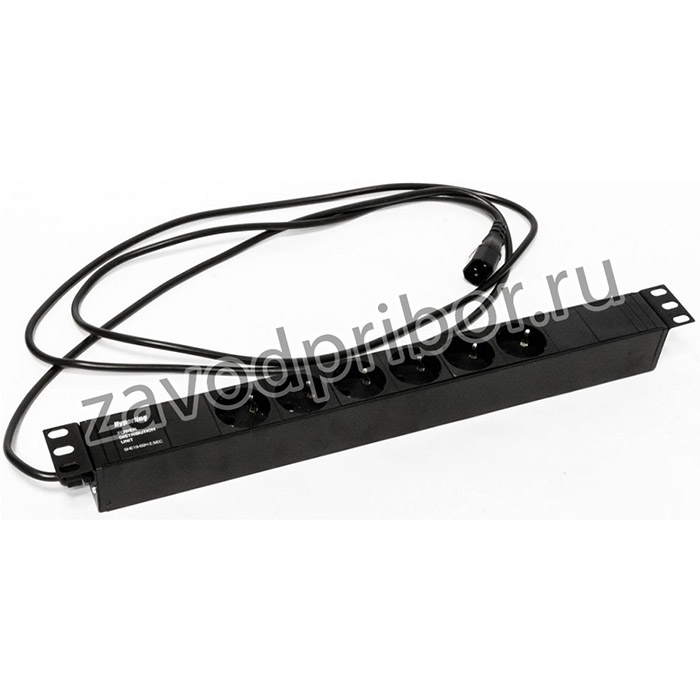Hyperline SHE19-6SH-2.5IEC Блок розеток для 19" шкафов, горизонтальный, 6 розеток Schuko, кабель питания 2.5м (3х1.0мм2) с вилкой IEC320 C14 10A, 250В, 482.6x44.4x44.4мм (ШхГхВ), корпус алюминий, черный