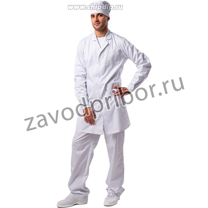 Халат антистатический мужской М-105У прямого силуэта с отложным воротником с лацканами. ESD-халат с центральной бортовой застежкой на 6 кнопок (возможен вариант застежки на пуговицы). Полочки с двумя нижними накладными карманами (в левый карман вшит знак ЕРА). На левой полочке предусмотрен нагрудный карман. Спинка на кокетке, по линии талии находится пояс-хлястик застегивающийся на 2 кнопки для регулирования обхвата талии. Рукава прямые, втачные, одношовные с цельнокроенными манжетами. Манжеты застёгиваются на кнопки (2 положения фиксации).