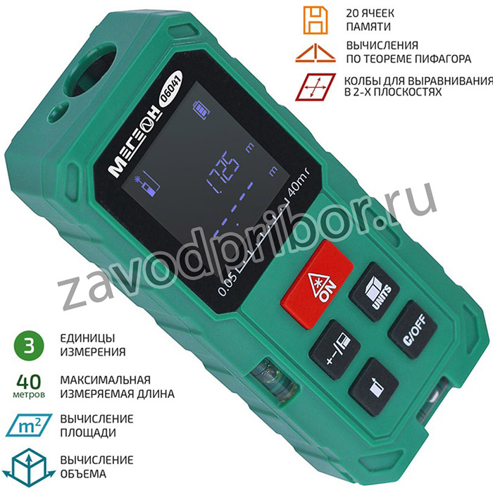 МЕГЕОН 06041 - портативный дальномер с обширным количеством измеряемых параметров. Модель получила стильный эргономичный корпус из яркого пластика и большой набор функций. Помимо бесконтактного измерения длины, предусмотрен расчёт площади, объёма и вычисление отрезков по теореме Пифагора. Благодаря простому меню и небольшим размерам достигается удобство при эксплуатации и хранении, а подсветка дисплея позволяет работать с изделием даже в тёмное время суток и в условиях ограниченной видимости. Применение комплектующих и микропроцессора высокого качества благоприятно сказалось на уменьшении погрешности и увеличении скорости обработки информации. Помимо получения текущих показаний имеется функциональная возможность исчисления максимальных и минимальных значений. Лазерный измеритель станет прекрасным помощником профессионалам при проведении строительных работ и других сферах жизнедеятельности человека.