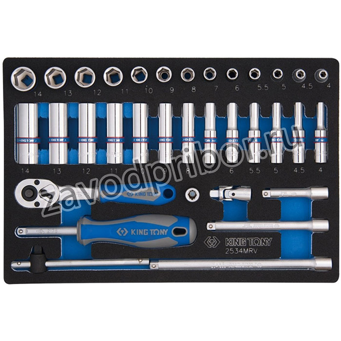 Набор шестигранных торцевых головок с принадлежностями KING TONY 1/4" 4-14 мм, 34 предмета 2534MRV включает в себя как оснастку, так и ручной инструмент.Ложемент из этиленвинилацетата (ЭВА) отличается устойчивостью к деформации и растворителям и оптимально подходит для размещения на инструментальной тележке. Кейс защищает комплект от ударов при транспортировке.