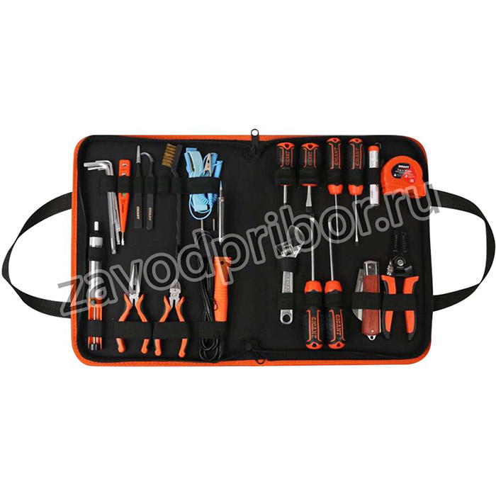 Набор электрика Gigant 27 предметов ELS27 преставляет собой комплект инструментов, которые могут использоваться для спайки деталей, ремонта изделий под напряжением и т.д. Подходит для профессионального использования электрика.Рабочие части выполнены из прочного и стойкого к нагрузкам материала. Набор поставляется в сумке для удобного хранения и транспортировки.
