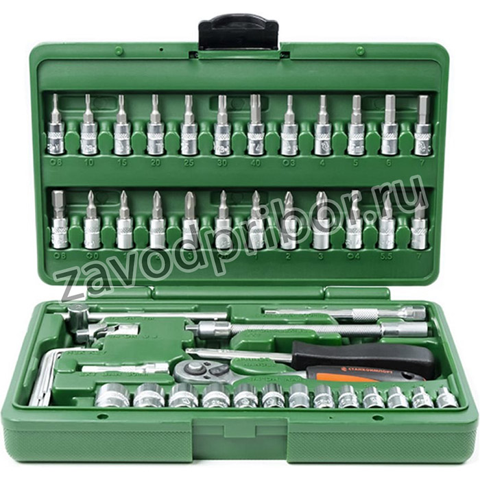 Набор инструментов Станкоимпорт 50 предмета НАБ.14.00.50 - надежный и качественный комплект инструментов для работы с крепежом. Сюда входит набор головок (посадочный квадрат 1/4") и биты, трещотка с флажковым переключателем и кнопкой быстрого сброса, несколько торцовых шестигранных ключей, вороток и удлинители. Этот набор отличается компактностью и практичностью. Инструменты выполнены из хром-ванадиевой стали, рукоятки трещотки и отверточной рукоятки - из пластика. Все элементы набора расположены в пластиковом кейсе. Для бит и головок пазы помечены. Простоту и удобство хранения и транспортировки обеспечивает надежный пластиковый замок. Заявка: