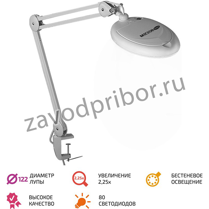 МЕГЕОН 02801 - новинка модельного ряда бестеневых ламп. Модель сочетает в себе: эргономичную форму, равномерную подсветку и высокую степень увеличения. Для установки изделия в комплекте предусмотрена струбцина, которая допускает крепление на край стола или полку стеллажа. Регулировка высоты осуществляется складной стойкой с пружинным механизмом удержания. Корпус изготовлен с применением современных и качественных материалов, а линза из минерального стекла. В качестве источника света были применены 80 ярких светодиодных элементов. Отличительной чертой такого освещения является: отсутствует мерцание и не раздражает глаза, а также продолжительный срок службы. Конспективный дизайн позволяет использовать изделие в производственном процессе, домашних условиях при чтении книг и даже в маникюрном салоне.