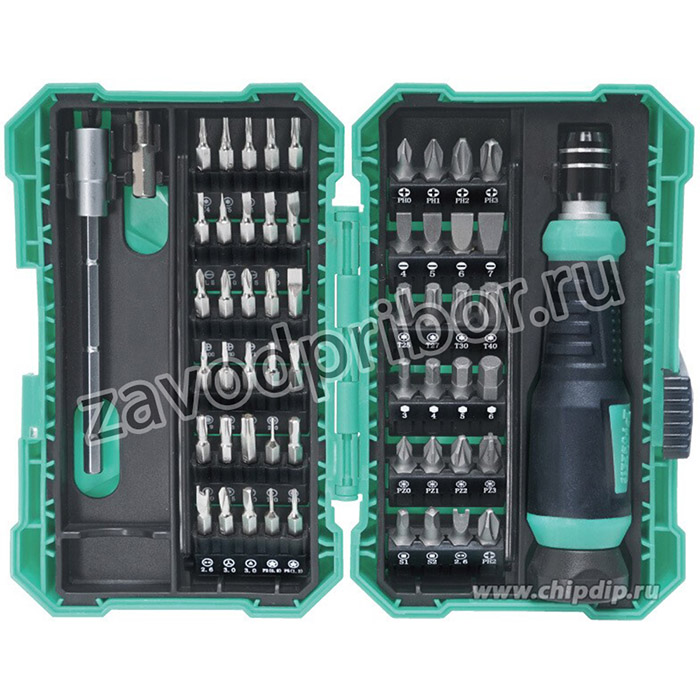 SD-9857M – набор, содержащий 54 сменных бит, изготовленных из высококачественной хромованадиевой стали, переходник с 1/4" на 4.0 мм и удлинитель с регулировкой.