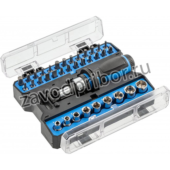 Описание продукта Набор, состоящий из отвертки с храповым механизмом, 25 сменных наконечников и 9 головок. Набор упакован в практичный органайзер для удобного хранения. Необходим для каждого профессионала. Характеристика . наконечники для отвертки изготовлены из высококачественной легированной стали S2; . головки изготовлены из высококачественной легированной хром-ванадиевой стали; . прочный, устойчивый к деформации и повреждениям; . храповая отвертка с переключателем направления: вправо / влево; . встроенный магнит надежно удерживает установленный наконечник; . штифт с накаткой для лучшего контроля работы наконечника при быстром вращении; . двухкомпонентная ручка с эргономичной нескользящей поверхностью, увеличивающей усилие зажима; . упакован в практичный органайзер, позволяющий хранить все элементы. Набор состоит из: Отвертка с храповым механизмом Сменных наконечников: SL 3 мм, 4 мм, 5 мм, 6 мм, 7 мм PH0, PH1, PH2, PH3 PZ0, PZ1, PZ2, PZ3 T10, T15, T20, T25 TT10, TT15, TT20, TT25 H3, H4, H5, H6 Переходника для головок 1/4” Головок 1/4”: 4 мм, 5 мм, 6 мм, 7 мм, 8 мм, 9 мм, 10 мм, 11 мм, 12 мм