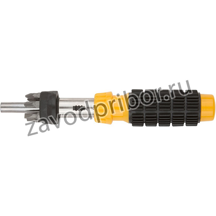 «Эконом». C магнитным фиксатором бит и резиновым картриджем для хранения бит. Пластиковая прорезиненная ручка. В наборе: 6 бит из хром-ванадиевой стали (SL5; SL7; PH2; PH3; PZ2; PZ3).