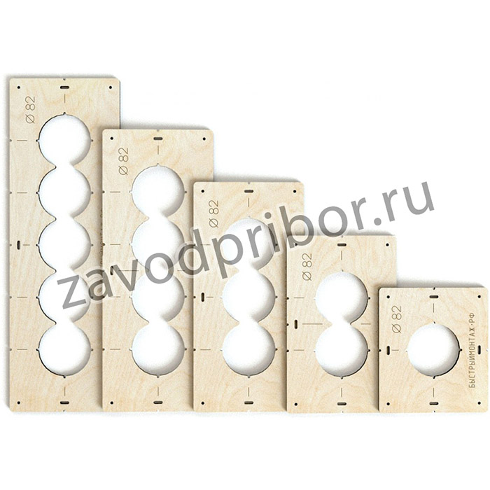 Комплект шаблонов BM-013-82 предназначен для мокрого и сухого сверления отверстий под подрозетники на стенах из бетона, кирпича, блока, гипсокартона, плитки, дерева и др.Комплект состоит из пяти рамок с количеством отверстий от 1 до 5. Изготовлен из текстолита толщиной 6 мм, имеет большой рабочий ресурс и запас прочности.