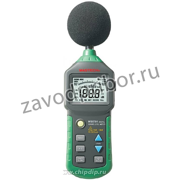 Цифровой шумомер Mastech MS6701 позволяет измерять уровень громкости звука и шумов в большом диапазоне и с высокой точностью. Отличается от модели MastechMS6701 наличием в комплекте поставки программного обеспечения для записи результатов измерения на компьютер и дальнейшей их обработки, а так же функцией памяти на 16000 записей значений измерений. Прибор имеет специальный измерительный микрофон, обладающий очень малой неравномерностью АЧХ и высокой чувствительностью, усилитель, корректирующий фильтр и большой ЖК-дисплей для отображения полученных результатов измерения.