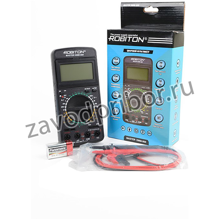 ROBITON MASTER DMM-900 - цифровой мультиметр, который измеряет постоянное и переменное напряжение, постоянный и переменный ток, сопротивление, емкость конденсаторов, hFE транзисторов, тестирует диоды и проверяет целостность цепи со звуковой индикацией. Среди дополнительных возможностей - кнопка включения, функция автоотключения, подсветка дисплея и память данных. Питание (в комплекте): 1* "Крона" 9В.ROBITON MASTER DMM-900 - удобный современный многофункциональный цифровой мультиметр для домашнего и профессионального использования. Устройство оснащено 3,5 разрядным жидкокристаллическим дисплеем с максимальным значением 1999.