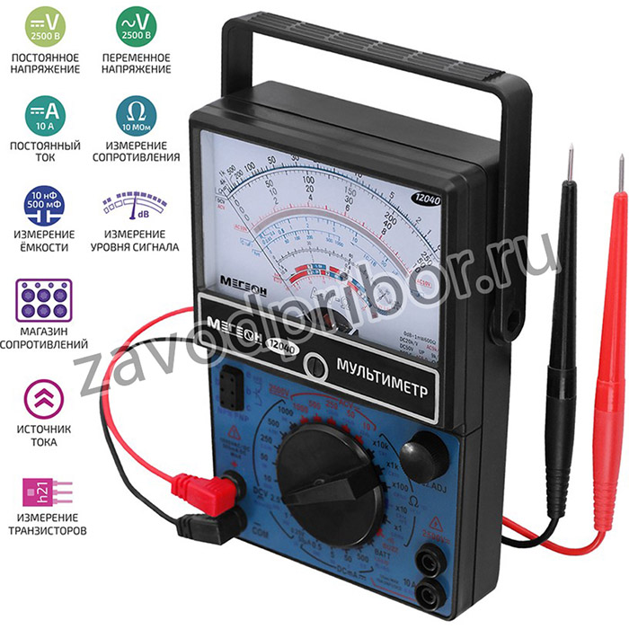 МЕГЕОН12040 – это многофункциональный электроизмерительный прибор, который представляет собой мультиметр со стрелочным индикатором. Он прост по конструкции и в использовании, но в то же время надёжен и обладает функционалом, которого не имеют цифровые мультиметры стоимостью на порядок выше. Например: измерение постоянного и переменного напряжения до 2500 В без дополнительных аксессуаров, оценка ёмкости и добротности конденсаторов, встроенный источник тока, и магазин сопротивлений, тестирование батареек и аккумуляторов под нагрузкой, создание собственных диапазонов. Более низкая точность с лихвой компенсируется невысокой ценой и быстрым откликом, который недоступен современным мультиметрам этой ценовой категории. Может найти широкое применение там, где необходимы его уникальные возможности.