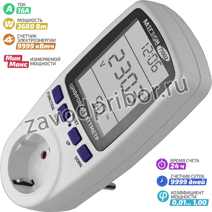 МЕГЕОН 71002 – это многофункциональный бытовой ваттметр с большим набором контролируемых параметров. Предназначен для демонстрации потребляемой мощности при продаже различных устройств и приборов, мониторинга сети, а также проверки электроприборов в разных режимах работы, чтобы чётко иметь представление о расходах электроэнергии. Поможет сбалансировать использование домашней электротехники, избежать перегрузки электросетей и подсчитать финансовые затраты, благодаря наличию функции установки стоимости одного киловатта в час. Позволит определить текущее значение тока нагрузки, а также установить минимальное и максимальное потребление мощности. Измеритель станет незаменимым помощником в быту. Удовлетворит требования даже самых искушённых потребителей при каждодневном контроле энергопотребления.