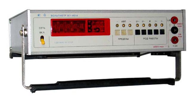 Вольтметр В7-40/4 – для измерения постоянного и переменного напряжений, силы постоянного и переменного токов, сопротивления постоянному току. Имеют выход на дистанционное управление (ДУ) и цифропечатающее устройство (ЦПУ) или в канал общего пользования (КОП). Применяются при настройке, проверке и эксплуатации различной радиоэлектронной аппаратуры и допускают использование как автономно, так и в составе информационно-измерительных систем.