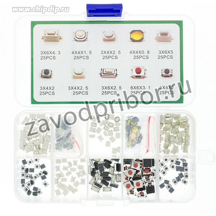 Набор тактовых кнопок/переключателей для поверхностного SMT-монтажа (250 шт). 10 типов переключателей по 25 штук, 250 штук в наборе. Поставляется в пластиком кейсе.