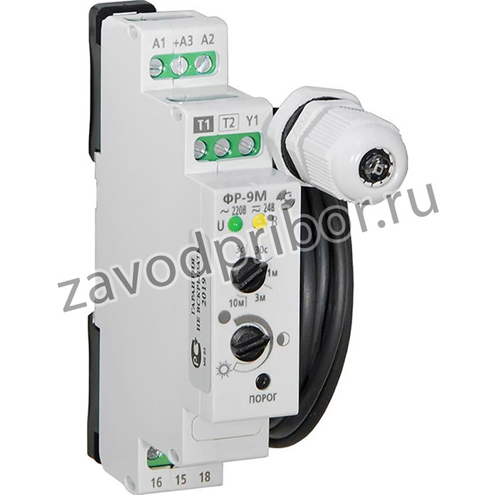 Фотореле типа ФР-9М предназначено для автоматического включения и отключения по установленной освещенности уличного освещения или мест общего пользования, индивидуальных рабочих мест и т. п., а также для применения в качестве комплектующего изделия в устройствах промышленной автоматики.Диапазон коммутируемых токов нагрузки: 16А