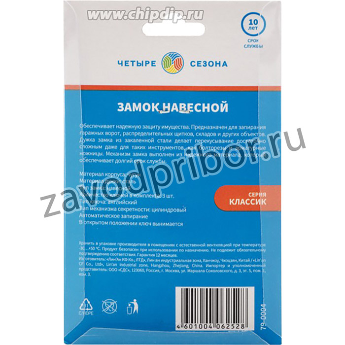 Навесной замок ЧЕТЫРЕ СЕЗОНА идеально подходит для защиты вашего имущества от непрошенных гостей. Замок пригодится для запирания гаражных ворот, распределительных щитков, складов и других объектов. Дужка замка выполнена из закаленной стали, что делает её перекусывание достаточно сложным даже для таких инструментов, как болторезы и арматурные ножницы. Механизм замка выполнен из долговечного и надежного материала.