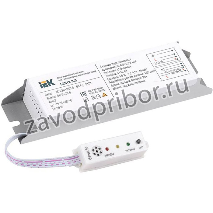 Блок аварийного питания (БАП) обеспечивает бесперебойную работу светодиодных светильников в случае непредвиденного отключения сети 230В или при снижении напряжения ниже порогового уровня. Блок включает 1 подключенную светодиодную линейку.БАП12-3 IEK встраивается в светильник или в выносной бокс и обеспечивает работу в аварийном режиме светодиодных ламп, светодиодных модулей (СИД) и светодиодных лент напряжением питания 6-20 В и максимальной мощностью от 3 Вт до 12 Вт.