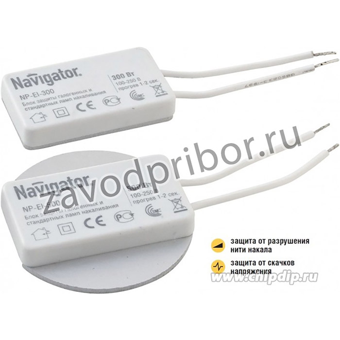 Блоки защиты Navigator серии NP предназначены для предотвращения частого перегорания галогенных ламп и ламп накаливания и продления их срока службы. Блоки защиты рассчитаны на совместную эксплуатацию с лампами накаливания и галогенными лампами на 220 В и 12 В. Устройство защищает лампы от скачков напряжения и обеспечивает плавный разогрев нити накала во время включений, что значительно замедляет процесс износа нити накала.