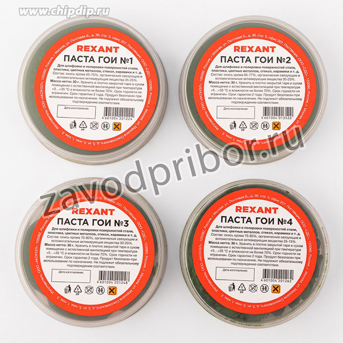 Паста ГОИ REXANT предназначена для шлифования и полирования стальных сплавов, цветных металлов, твердых пластмасс и полимеров, стекла (в том числе оптического), керамических материалов и изделий из них, тем самым устраняя мелкие царапины и создавая ровный блеск полируемой поверхности. Паста состоит из оксида хрома, который придает зеленый цвет, в виде абразивного порошка, жировых органических связующих, а также вспомогательных веществ, которые делают добавки более активными и интенсивными. При правильном использовании паста позволит добиться идеально ровного покрытия и вернет первозданный вид различным предметам.Данный набор состоит из всех возможных видов пасты, что дает возможность использовать полировальную массу с различными материалами и в любых целях.