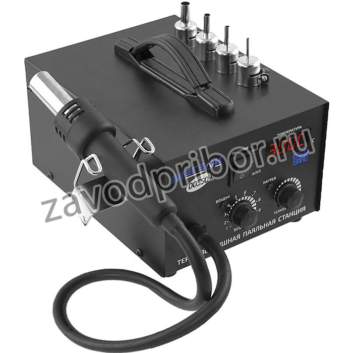 МЕГЕОН 00550 – термовоздушная паяльная станция с цифровой индикацией температуры. В изделии для нагнетания воздуха используется классический поршневой компрессор, аналоговое управление, цифровая индикация и стабилизация температуры. Для удобства работы и увеличения качества пайки комплекте к термофену дополнительно поставляется четыре сменные насадками. В конструкции элементов управления реализована возможность плавного регулирования температуры и скорости воздушного потока, а яркий светодиодные дисплей сделают эксплуатацию максимально простой. В конструкции термофена также предусмотрена возможность установки держателя фена. Для переноски термофена предусмотрена рукоятка.Гарантийный срок обслуживания составляет 3 года. Таким образом термовоздушная паяльная станция МЕГЕОН 00550 станет незаменимым помощником в работе с электрокомпонентами.