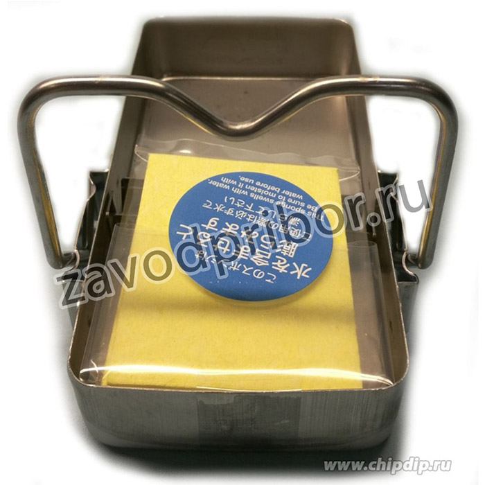 Портативная складная подставка для паяльника с большой целлюлозной губкой. Материал подставки - нерж. сталь. Перед работой необходимо смочить губку в воде.