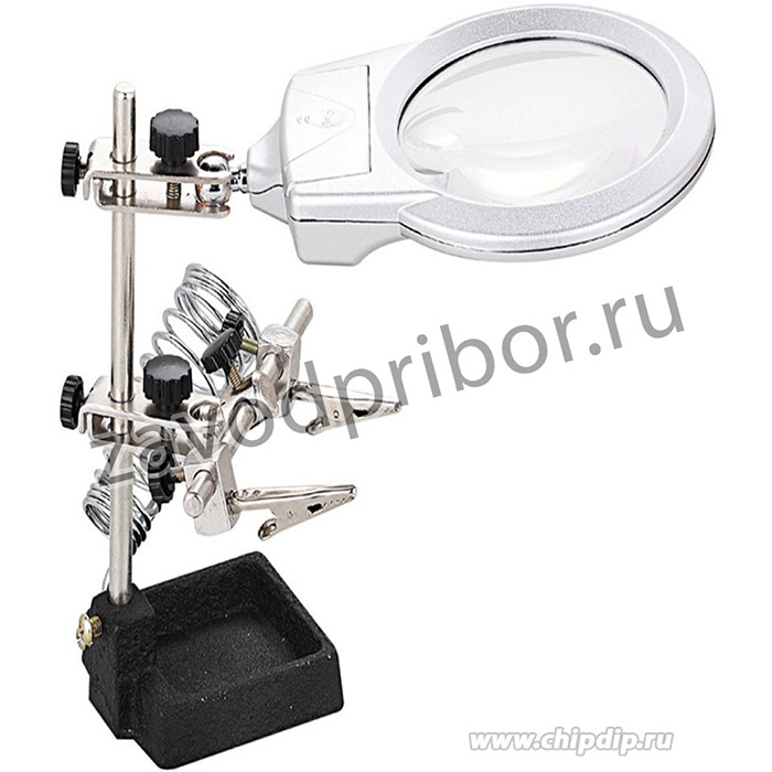 Обеспечивает двукратное увеличение. Оснащен двумя зажимами <крокодил>, подставкой для паяльника и зажимом для пайки с лупой <третья рука>.Светодиодная подсветка линзы (ААА 1,5V - 3 шт). Заявка:
