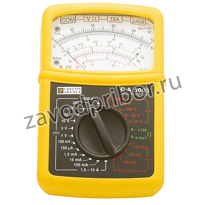Прочный корпус с многофункциональной подставкой "Multistand" позволяет использовать мультиметр как на производственном участке, так и в лаборатории. Диапазоны измерения тока защищены плавкими предохранителями с высокой перегрузочной способностью, исправность которых показывает индикатор "Fus".В приборе СА 5003 обеспечена автоматическая установка нуля омметра. Во время измерения сопротивления или проводимости для предотвращения ошибочного подключения на индикаторе "Voltest" отображается присутствие внешнего напряжения в измеряемой цепи