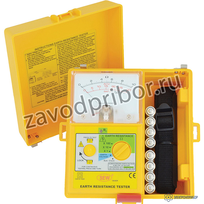 Измеритель сопротивления заземления 1805 ER: Возможность измерения шагового напряжения; Тестовый ток 2 мА, что позволяет измерять сопротивление без отключения схемы измерения; В состав комплекта включены соединительные провода и измерительные штыри; 3_ аналоговая шкала; Удержание результата измерения; Батарейное питание; Индикация разряда батареи; Простота, компактность, надёжность; Масса 1 кг.