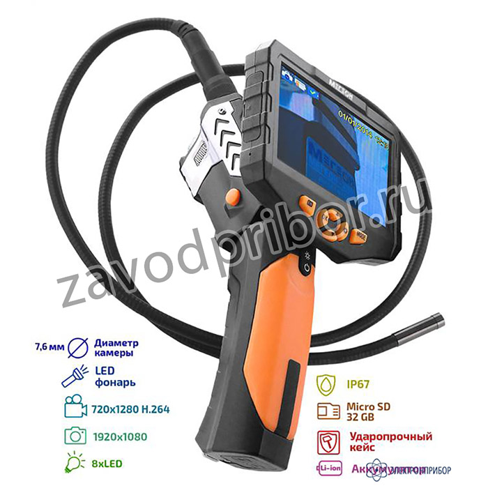 Большой ЖК-дисплей с разрешением 854х 480 и диагональю 4,3' отчётливо отобразит всё происходящее перед камерой. Зонд диаметром 6,9 мм и длиной 1 метр имеет полужёсткую конструкцию. Подсветка оснащена шестью яркими светодиодами со ступенчатой регулировкой яркости, которые обеспечивают работу в условиях полного отсутствия освещения.