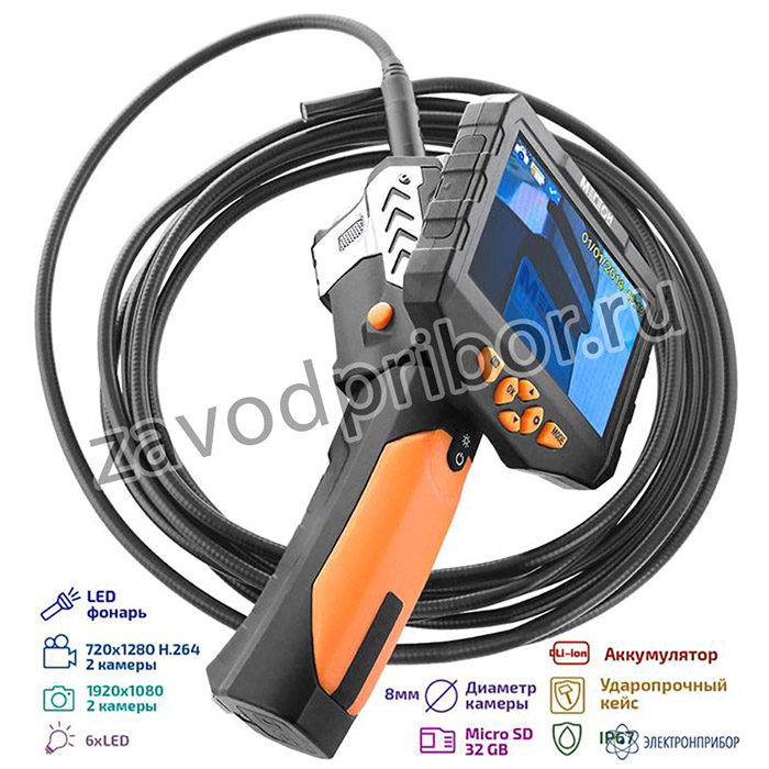 Большой ЖК-дисплей с разрешением 854х 480 и диагональю 4,3' отчётливо отобразит всё происходящее перед камерой. Зонд диаметром 3,5 мм и длиной 3 метра имеет жёсткую конструкцию. Подсветка оснащена шестью яркими светодиодами со ступенчатой регулировкой яркости, которые обеспечивают работу в условиях полного отсутствия освещения.
