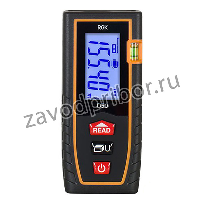 Экран повёрнут на бок — это позволило уменьшить размеры корпуса, при этом выводя результат крупными, хорошо видимыми цифрами. Дополнительно дисплей сообщает информацию о единицах измерения, заряде батареи, активной функции и точке отсчёта — дальномер RGK D50 выполняет измерения только от задней плоскости корпуса. Встроенная подсветка обеспечит комфортную работу при недостатке освещения: в сумерки и в тёмных помещениях.