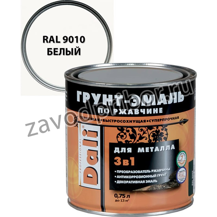 Грунт-эмаль Dali 3 в 1 по ржавчине белая 0.75 л наносится внутри и снаружи помещений по любым металлическим поверхностям, новым и ранее окрашенным: стальным и чугунным (решетки, ограды, гаражи, ворота и пр.)